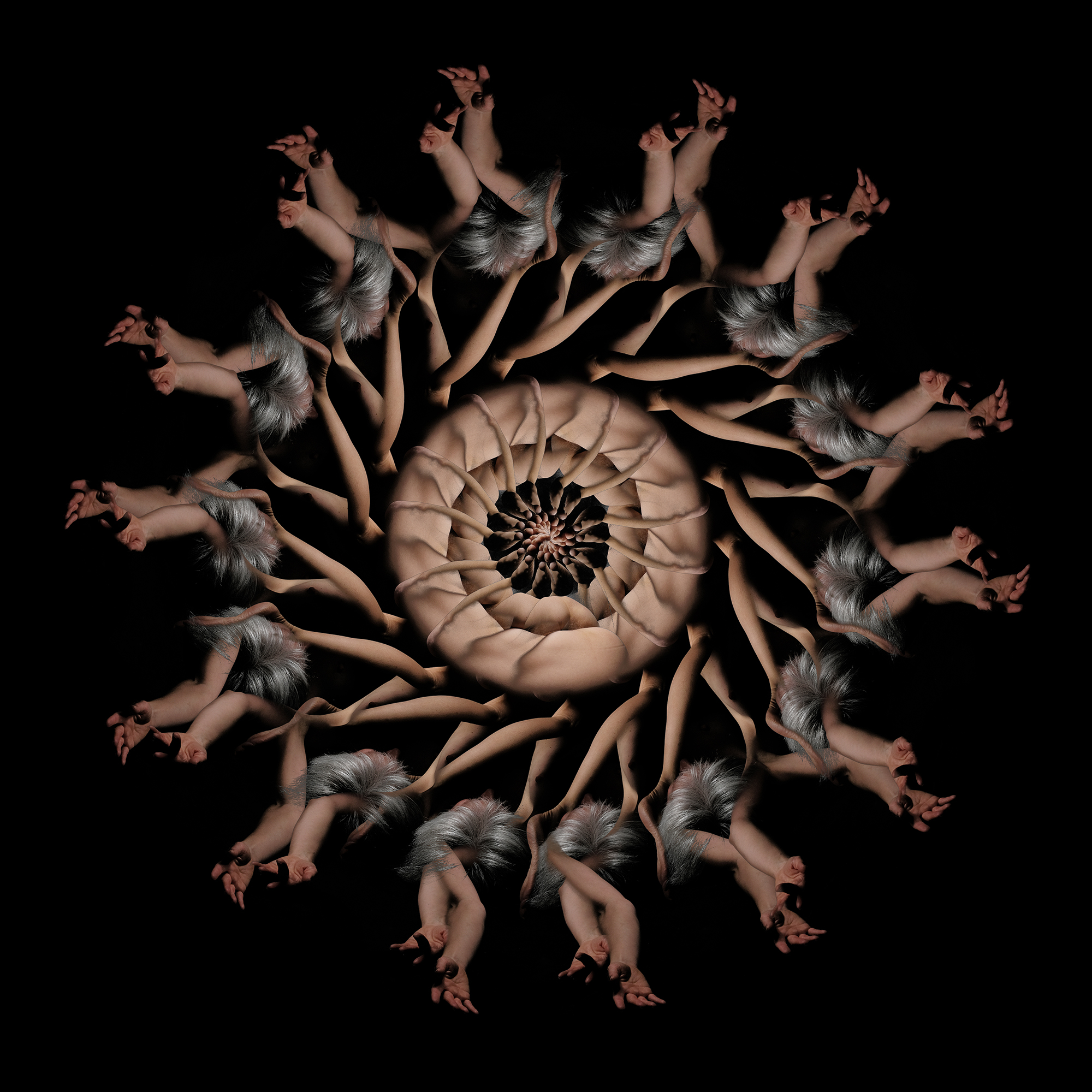Inspiré par ses recherches plastiques et esthétiques, le photographe prend le temps de transformer le corps humain en calligraphie. « La démocratisation des moyens technologiques me permet de gérer l’ensemble de la chaîne graphique à domicile. Le travail de postproduction, souvent négligé car chronophage, peut devenir soigné lorsqu’on a plus que cela à faire », précise-t-il. Comme des chorégraphies, les kaléidoscopes révèlent la grâce de la modèle, et sa sensibilité. « C’est bien la qualité du mouvement dansé qui donne à ces images leur sens», conclut Antoine Dubroux. Loin de l’anxiété générale, causée par l’enfermement, l’artiste signe ici un éloge du corps – celui qui se contorsionne sur scène, et celui qui apparaît dans l’intimité.